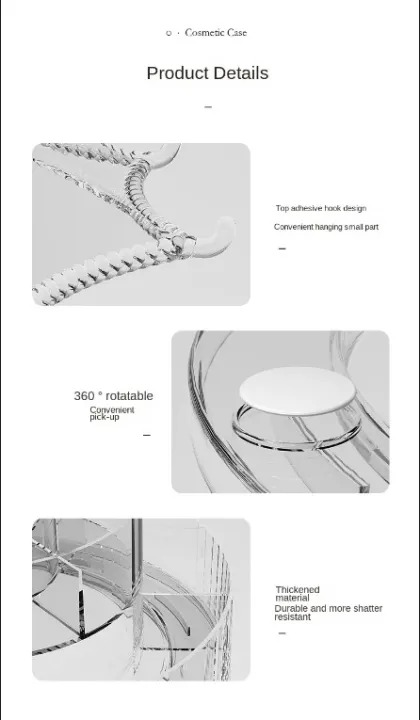 Crafted from premium clear acrylic, it provides durability, stability, and a crystal‑clear view of all your essentials. The 360° rotating base ensures easy access to every product, while the umbrella‑style top adds decorative charm with a modern touch.