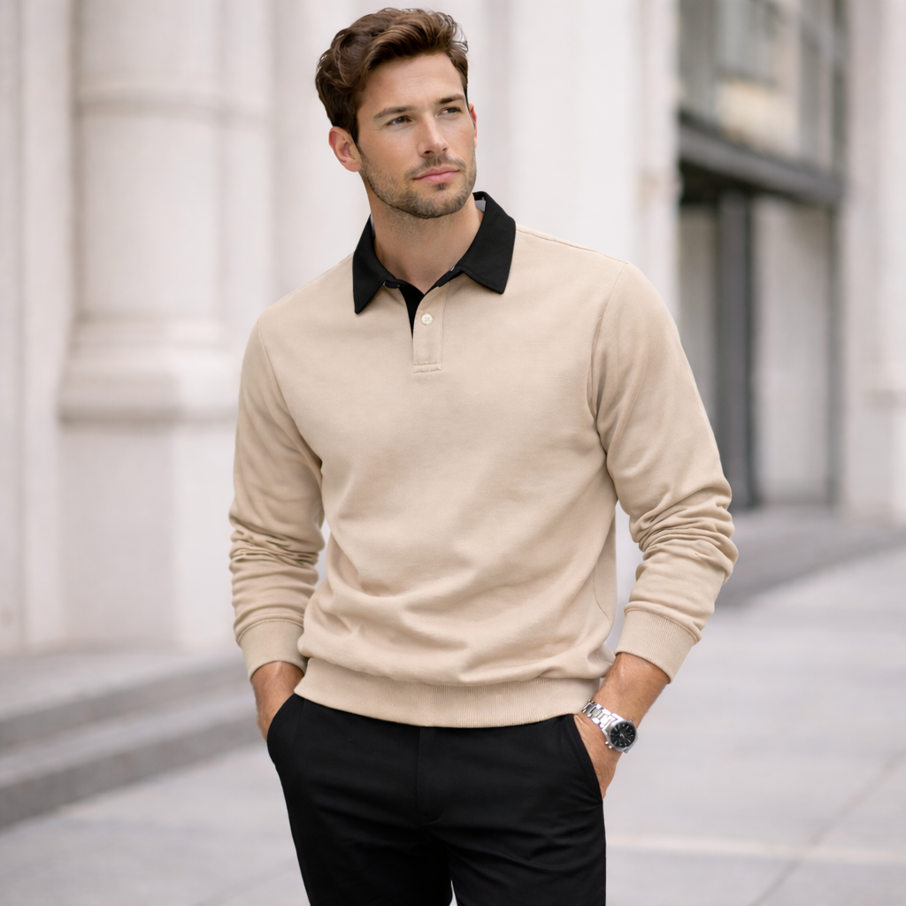 Black & Beige Polo Collar Long Sleeve Sweatshirt for Mens