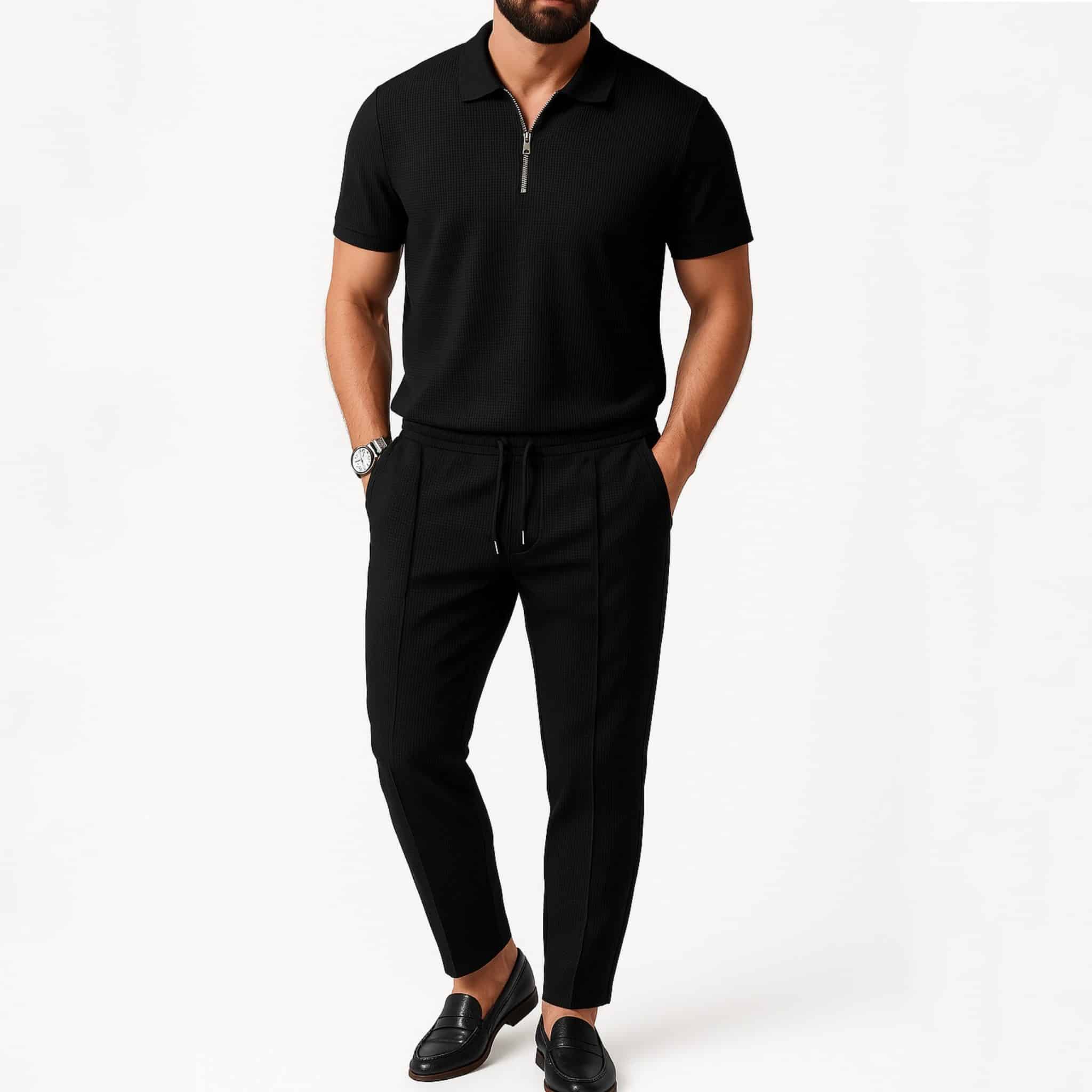 Elevate your everyday comfort with our black premium waffle knit tracksuit for men — featuring a stylish zipper neck half-sleeve shirt paired with matching trousers.