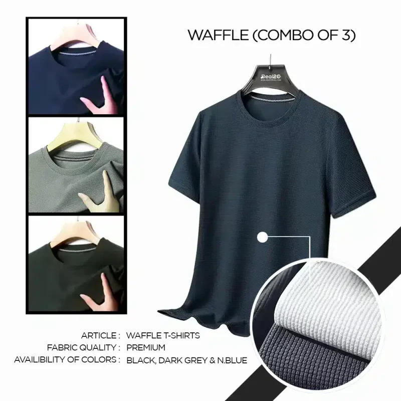 Upgrade your everyday wardrobe with our Bundle of 3 Lightweight & Breathable Waffle T-Shirts for Men, crafted from premium-quality polyester for all-day comfort and a sleek, modern look. The soft waffle-textured fabric not only feels great on the skin but also enhances breathability, making these tees perfect for warm weather or layering. Whether you’re heading to the gym, lounging at home, or going out casually, this versatile 3-pack combo in Black, Dark Grey, and Navy Blue gives you the perfect mix of comfort, durability, and effortless style – all in one deal.