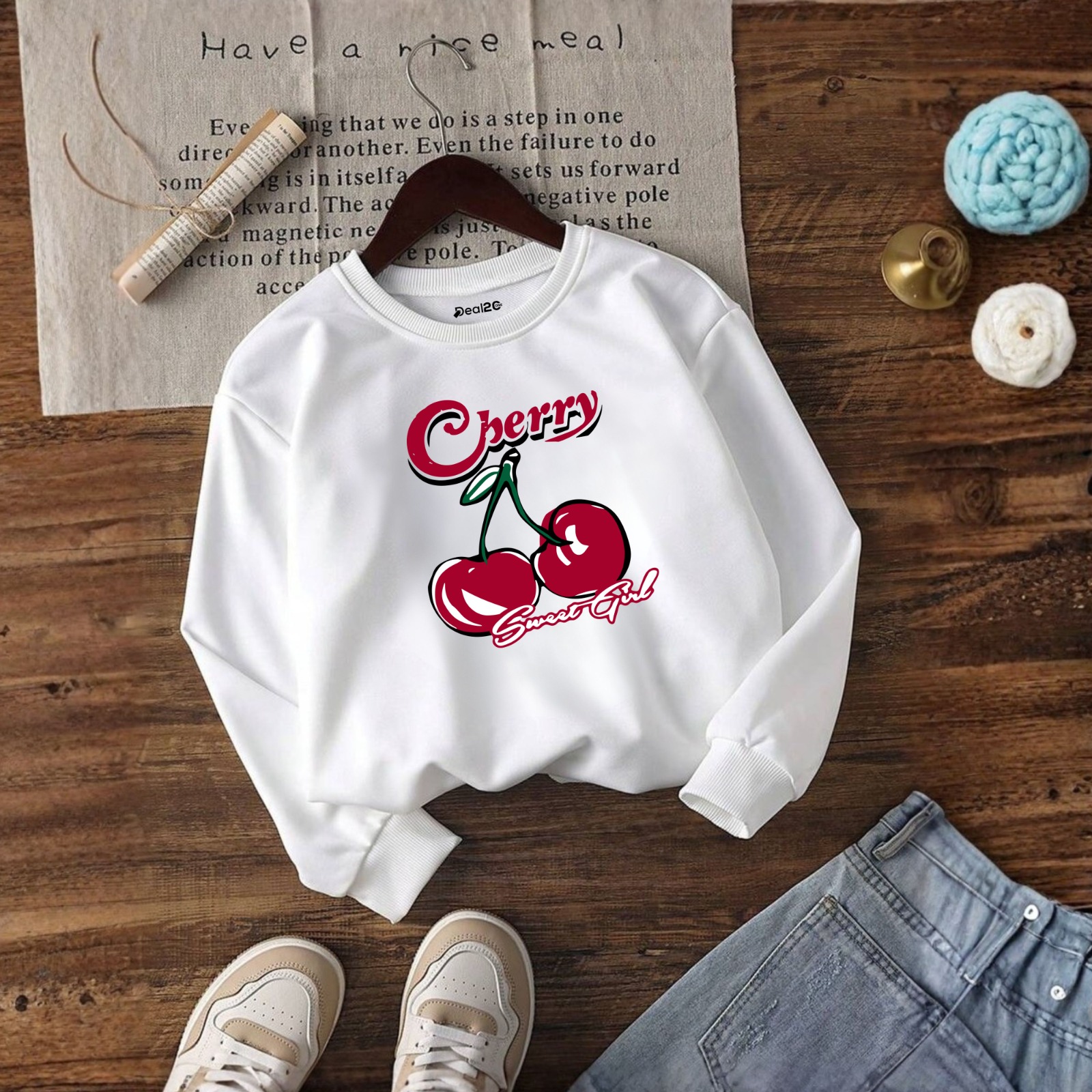 ✅ Cherry Mood Printed White Sweatshirt for Girls