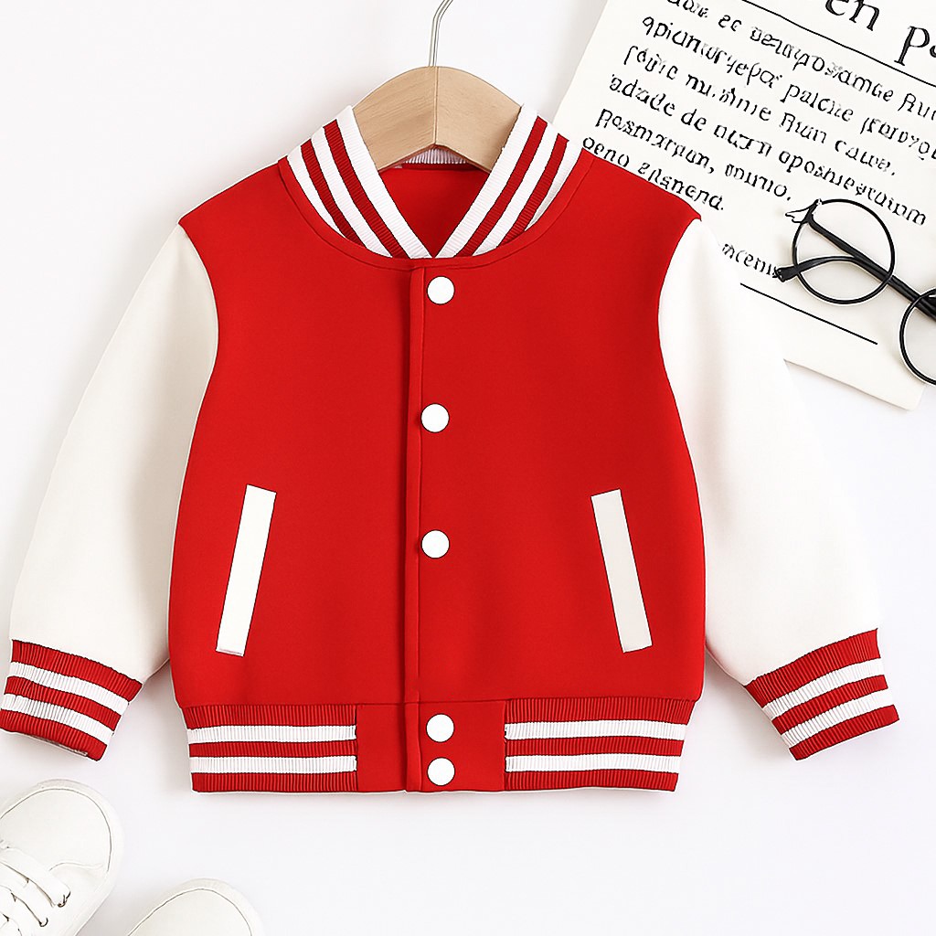 Introducing the Cherry Spark – Red & White Varsity Jacket for Girls, a bold and stylish piece that blends comfort, fashion, and practicality. Perfect for school days, playdates, or weekend outings, this jacket ensures your little one stays cozy while making a confident style statement.