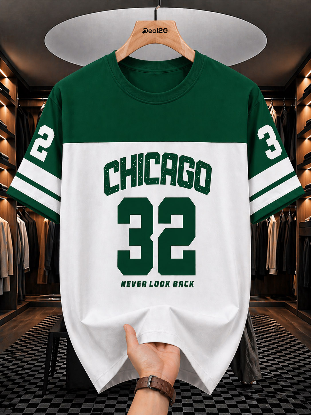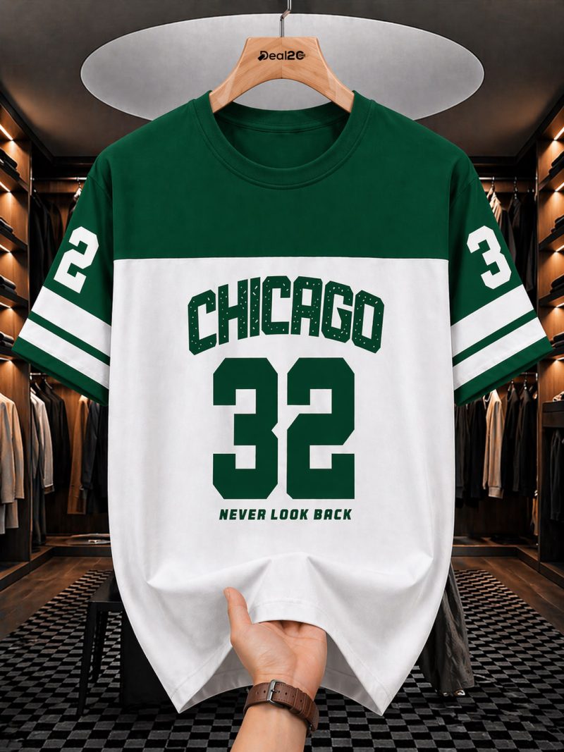 Make a statement without trying too hard with this Chicago 32 Printed Green T-Shirt For Mens—fresh, bold, and built for everyday confidence. The clean white base is paired with a rich green upper, creating a sharp two-tone contrast that feels both classic and eye-catching. The “CHICAGO 32” varsity-inspired print on the front brings that strong, athletic vibe—simple, clean, and impactful.
