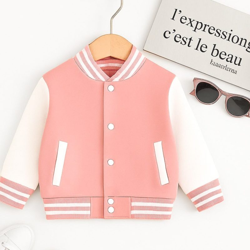 Introducing the Cotton Candy Pop – Pink & White Varsity Jacket for Girls, a sweet mix of style, comfort, and everyday practicality. Designed for young fashion lovers, this jacket is perfect for school, playdates, or casual outings — keeping your child warm while making a bold style statement.