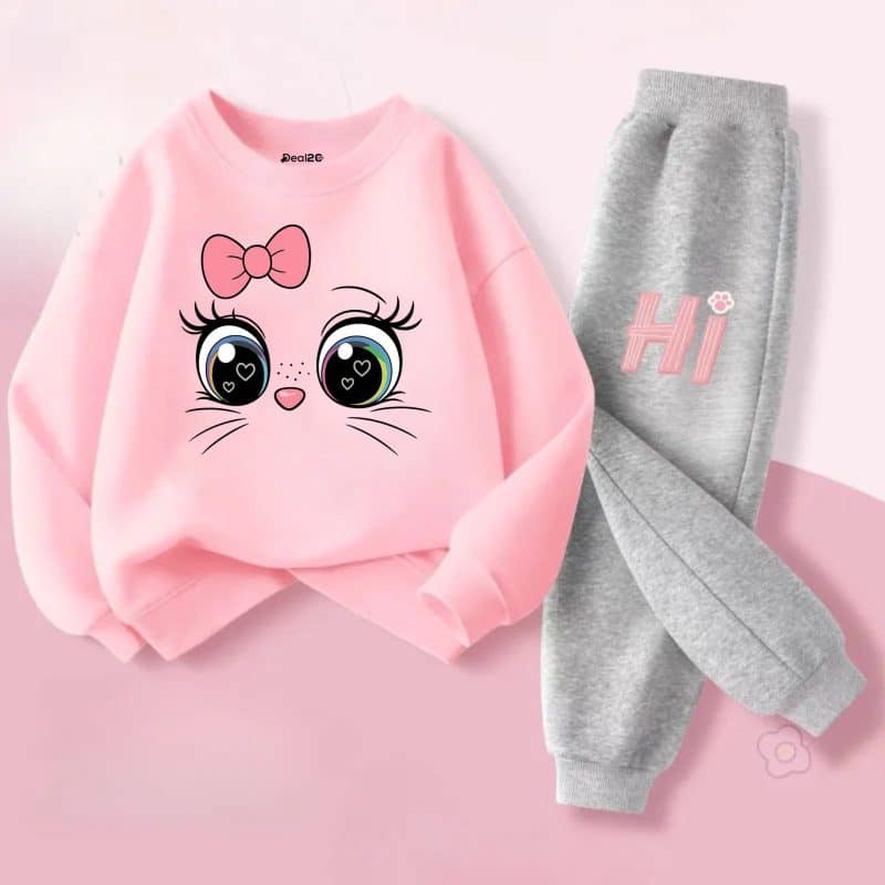 Cute Cartoon Cat Printed Sweatshirt Tracksuit For Girls