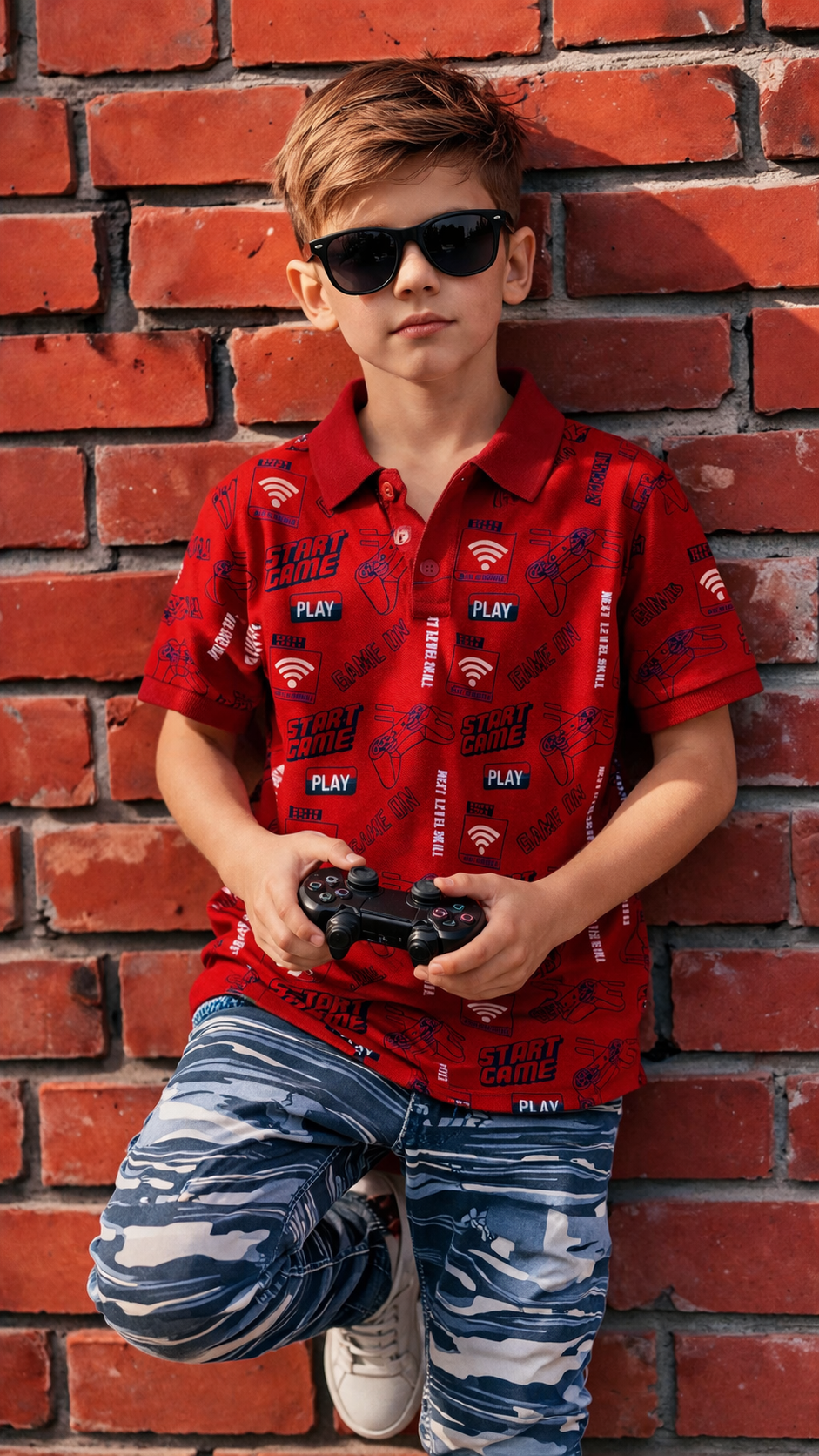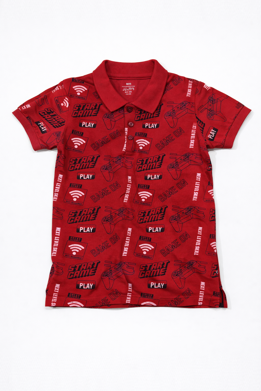 Featuring a cool gaming-inspired print, this polo shirt adds a fun and energetic touch to your child’s wardrobe. The design reflects a playful and modern gaming vibe—perfect for kids who enjoy expressing their unique personality.