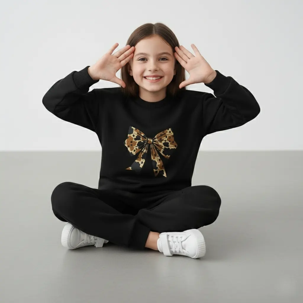 ✅ Girls Black Leopard Bow Sweatshirt & Joggers Set