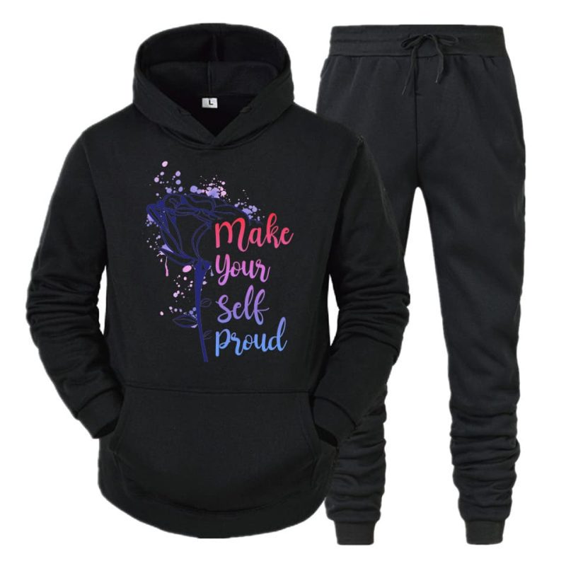 Modern Design: The sleek, modern silhouette fits perfectly, providing a flattering and trendy look. The hoodie comes with an adjustable drawstring for added style and function, while the matching track pants feature an elastic waistband for a comfortable, customizable fit.