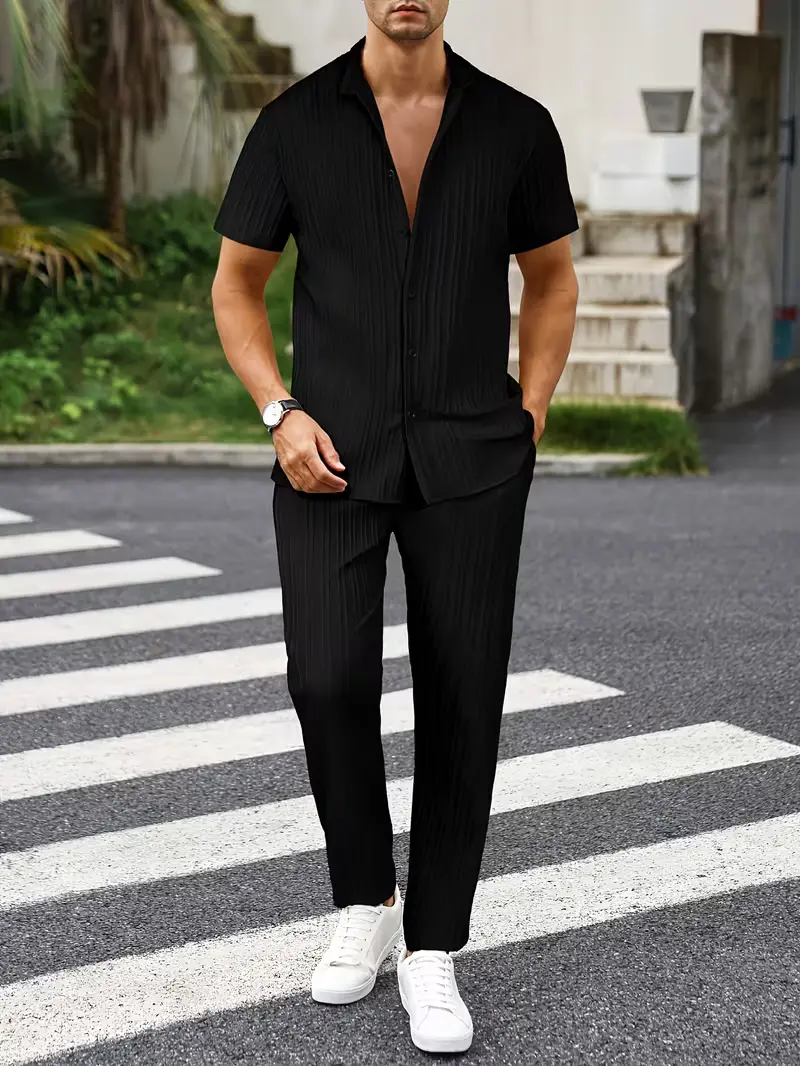 Men Black Color Textured Short-sleeve Shirt and Trouser Set