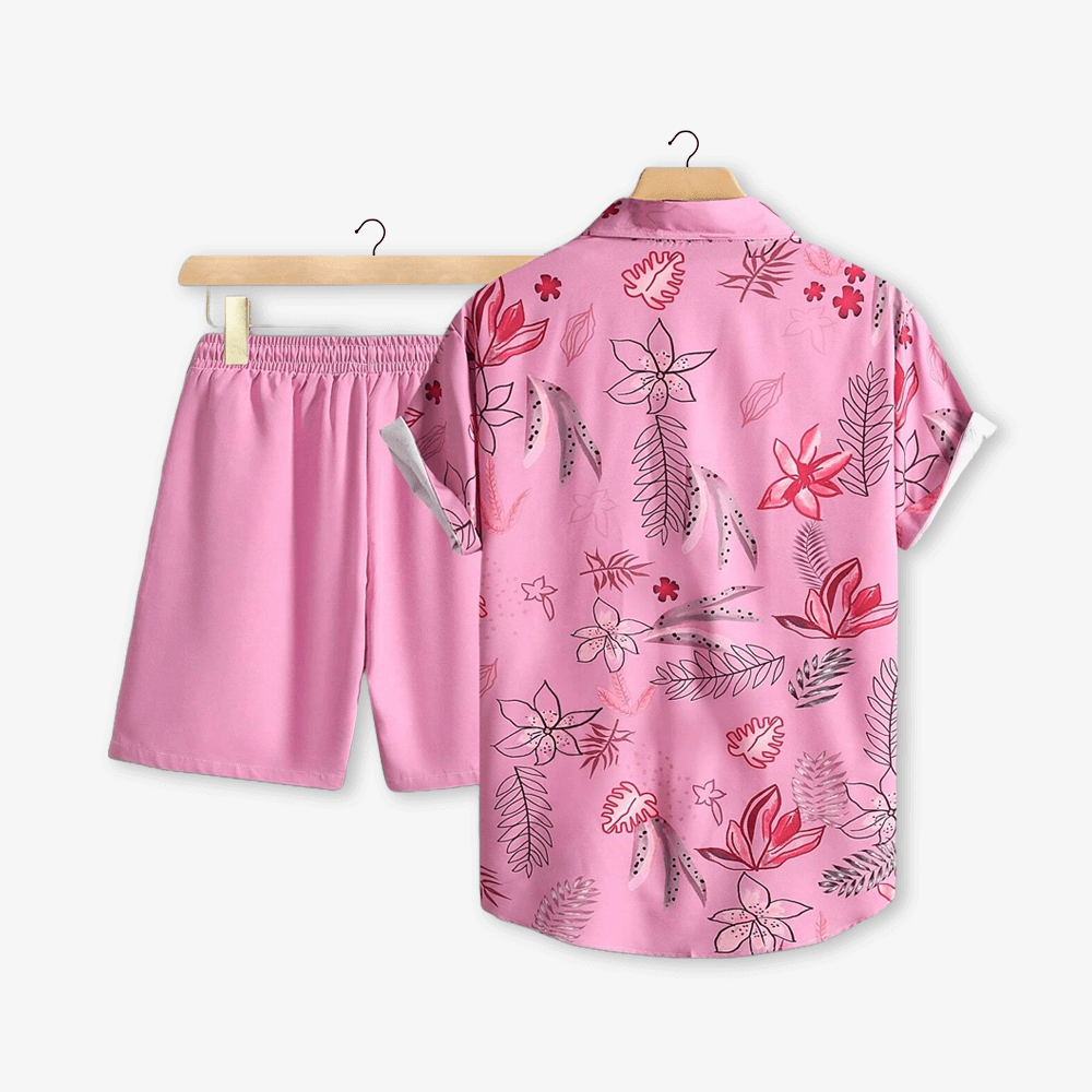 Men Casual Pink Hawaiian Floral and Leaf Printed Summer Outfit