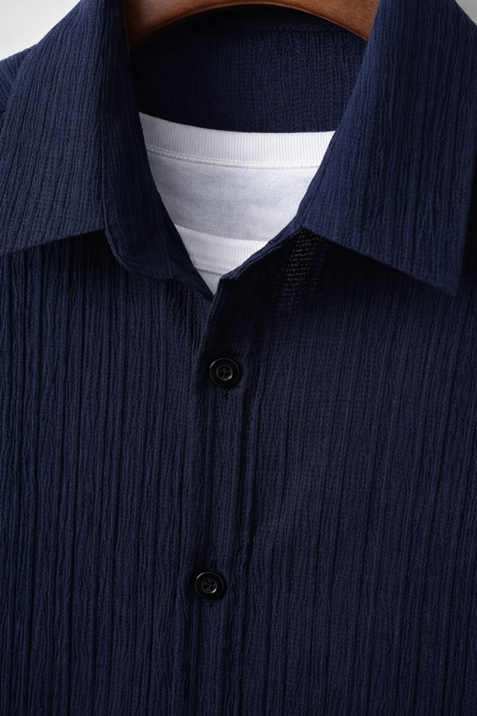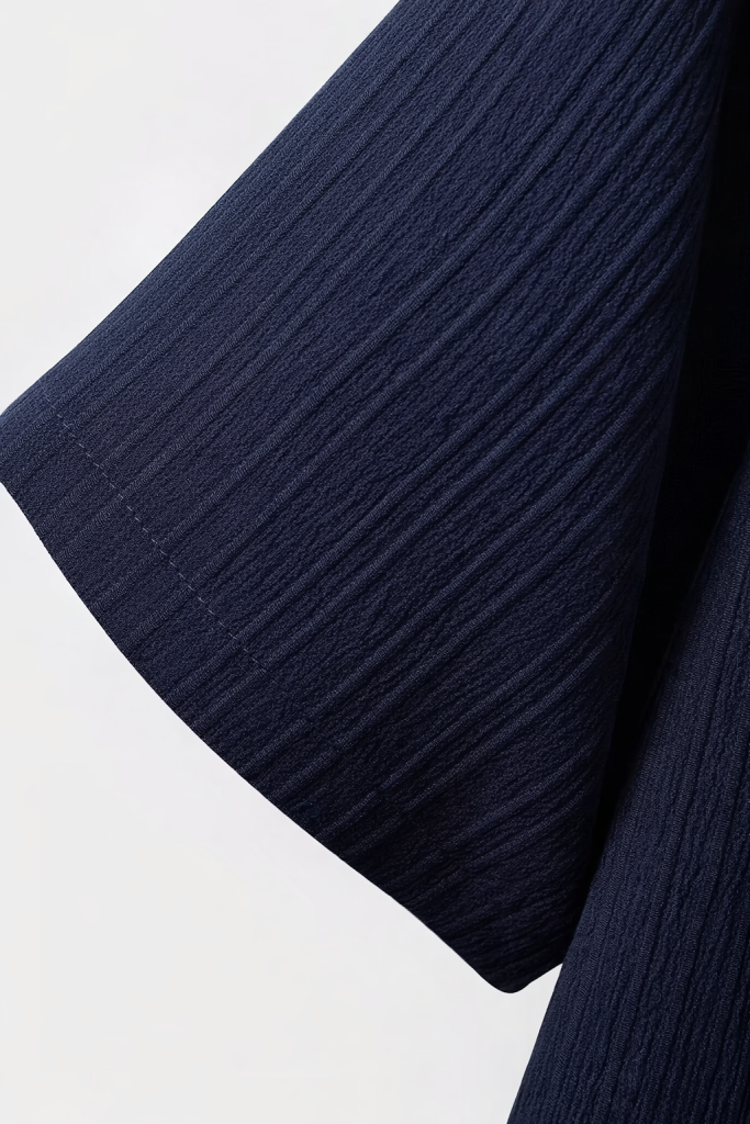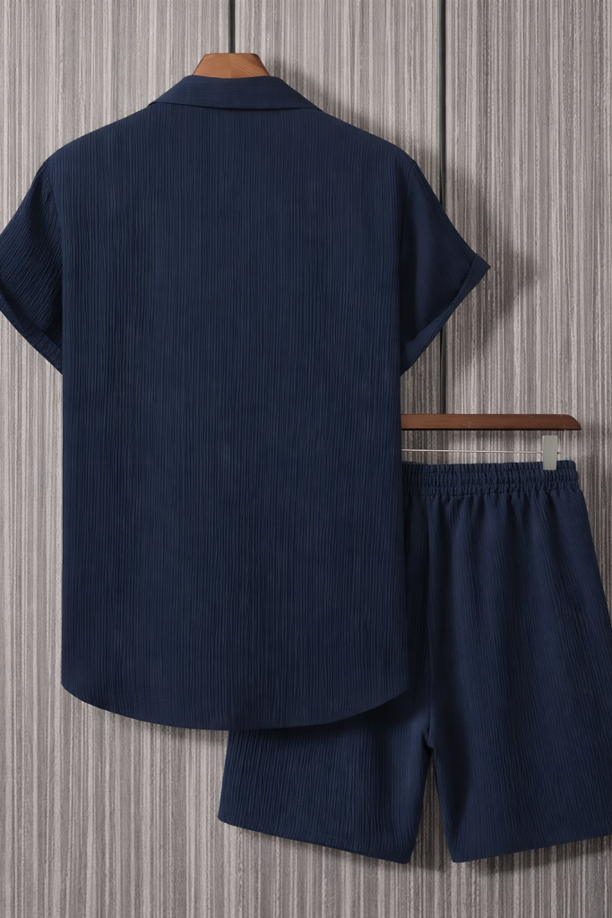 Upgrade your warm-weather wardrobe with this Mens Navy Blue Jacquard Textured Short-sleeve Shirt and Shorts Set — a clean, modern co-ord designed for comfort and effortless style. Featuring a subtle vertical textured pattern, this two-piece outfit delivers a premium look while staying lightweight and breathable for all-day wear.