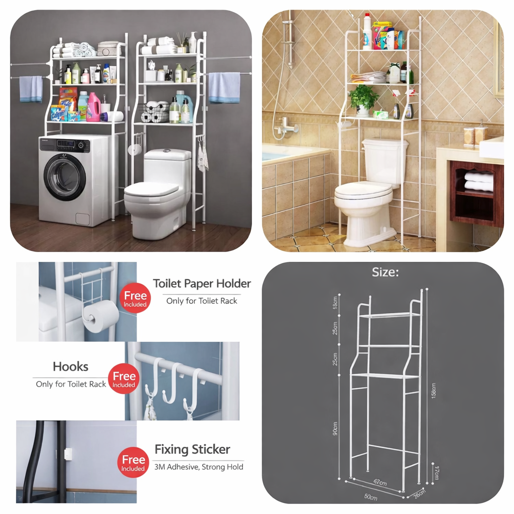 Organize your bathroom or laundry space with the Metal Toilet Rack – White Storage Organizer. This durable rack fits perfectly over toilets or washing machines, offering multiple shelves for towels, toiletries, and cleaning supplies.