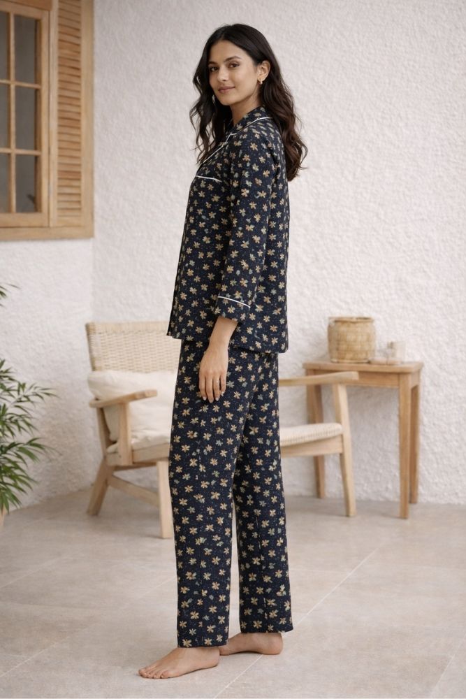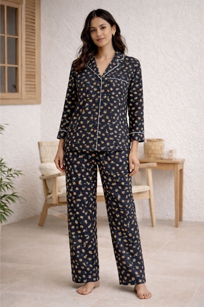 Experience timeless comfort with the Midnight Bloom Floral Piped Nightwear Set for Women, crafted from breathable jersey fabric for all-night ease. This two-piece set features a deep, sophisticated dark base adorned with blooming floral motifs, finished with chic piping details for a refined and elegant look.