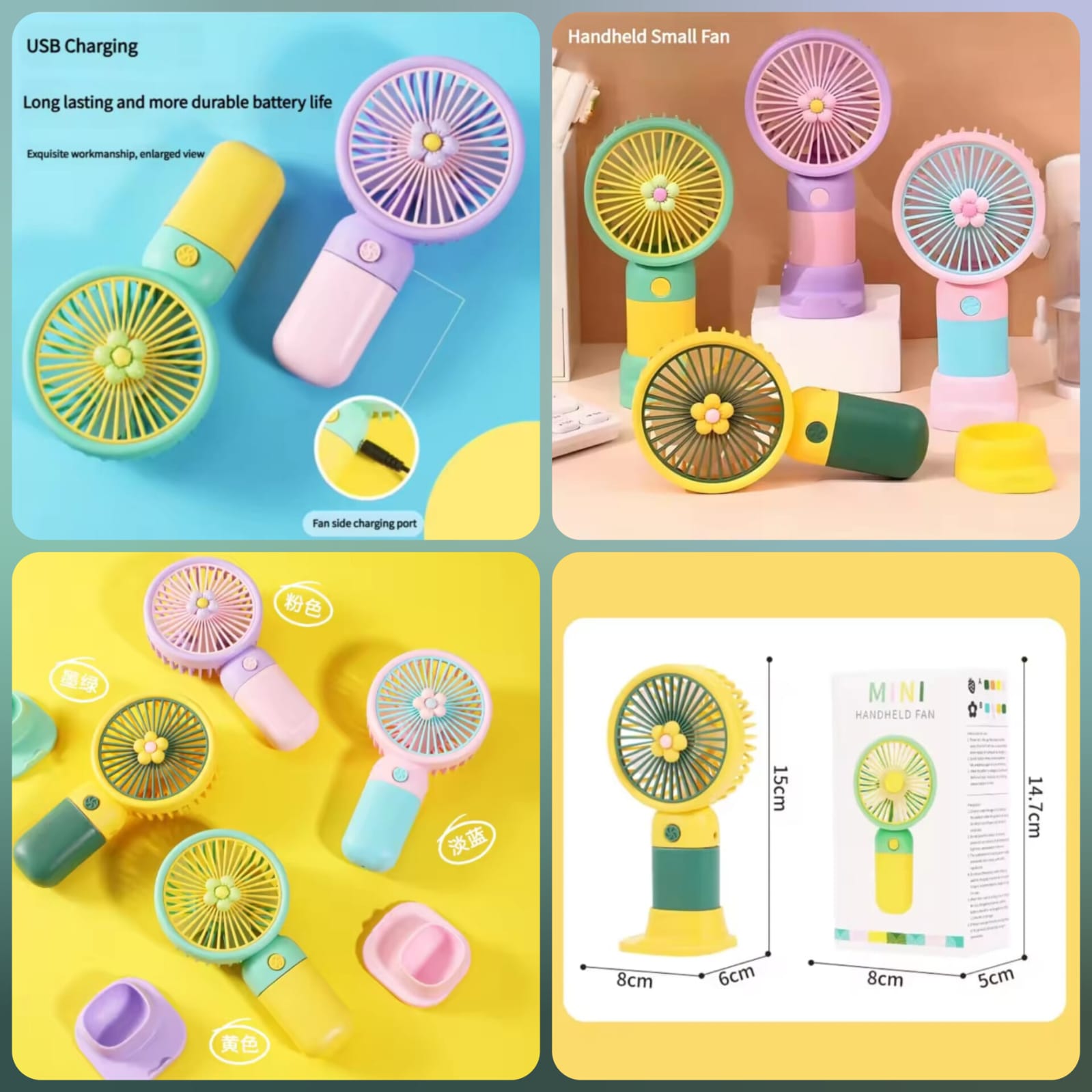 Stay cool anywhere with the Mini Hand Fan – USB Rechargeable portable cooling device. Compact and lightweight, this handheld fan is designed with pastel colors and a flower‑shaped blade center, making it both stylish and functional.