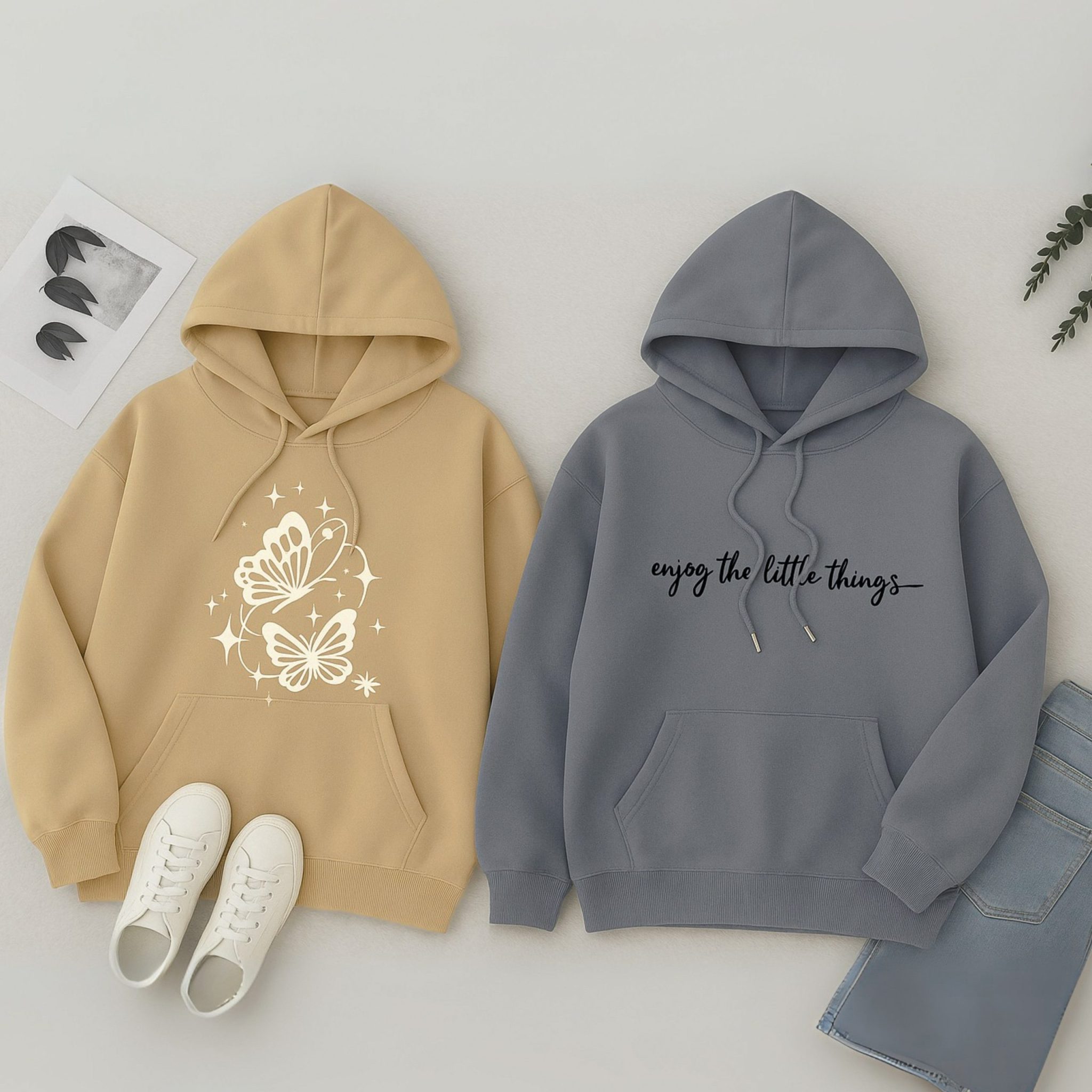 Introducing our Pack of 2 Enjoy Little Things Printed Hoodies for Women – a perfect blend of cozy comfort, uplifting style, and everyday warmth. Crafted with care, these hoodies are designed to become your favorite go-to for casual outings, relaxing at home, or layering through cooler days.