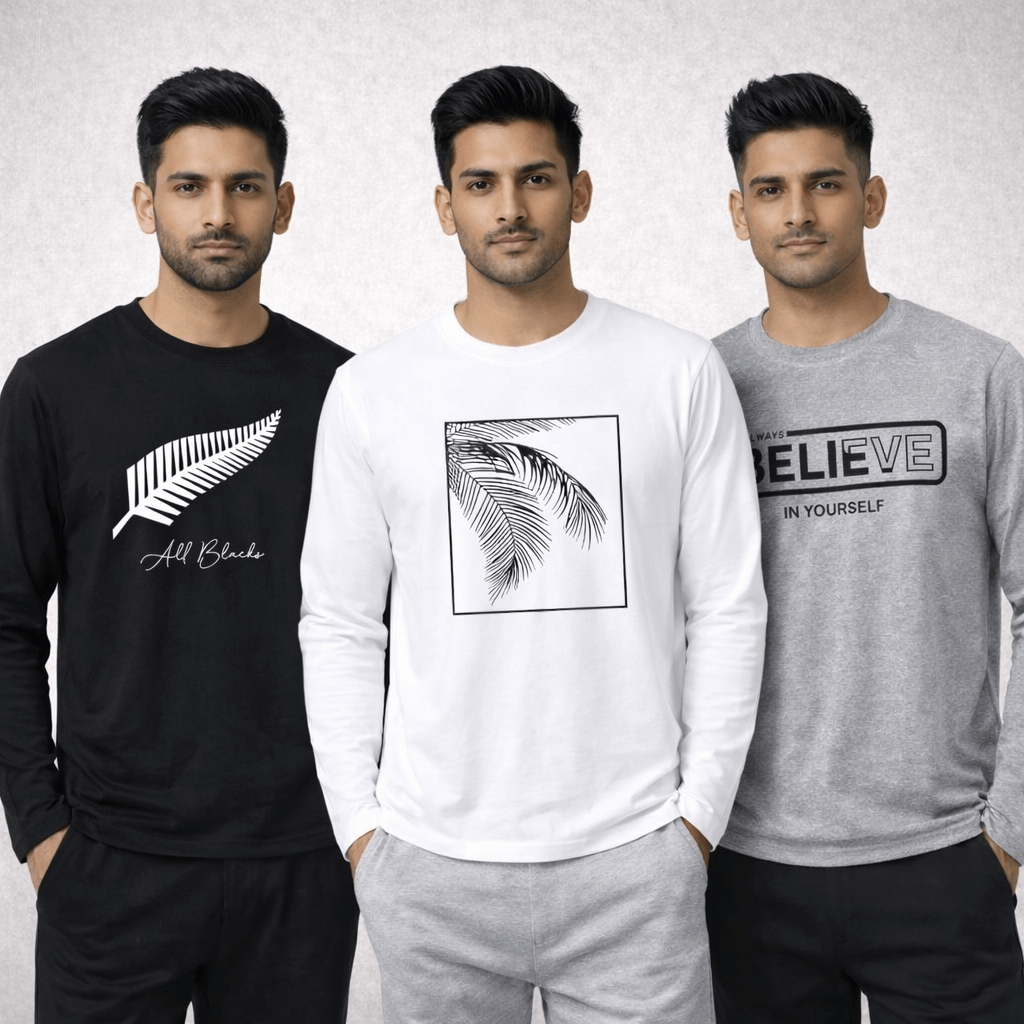 Pack of 3 All Black Believe Printed Long Sleeve T-shirts for Men is thoughtfully designed to inspire confidence while keeping your everyday style on point. These long-sleeve t-shirts offer a comfortable fit and a clean, modern look, making them suitable for casual outings, daily wear, or relaxed weekends.