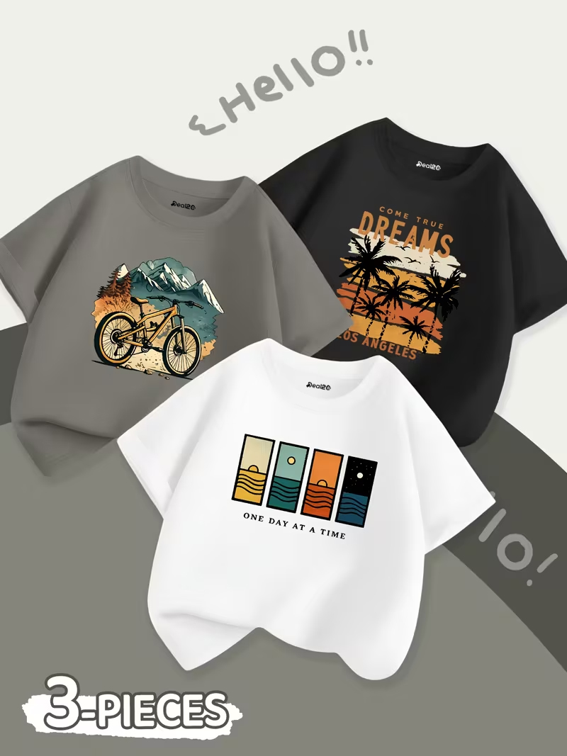 Upgrade your wardrobe with our exceptional Pack of 3 Dream Ride Sunset Printed T Shirts For Kids today and experience the perfect fusion of fashion and functionality. Stay stylish.