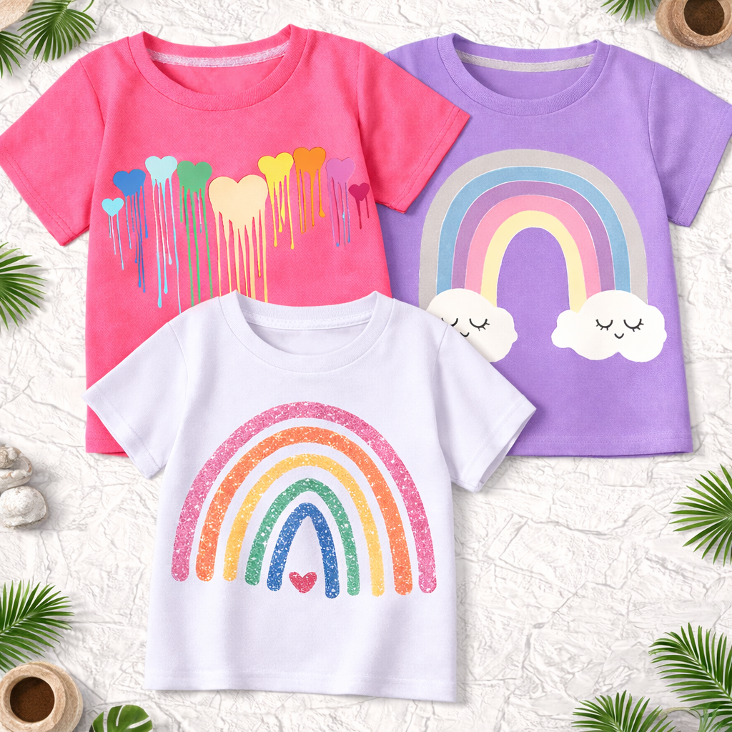 Pack of 3 Glitter Rainbow Tee Printed T-shirts for Girls