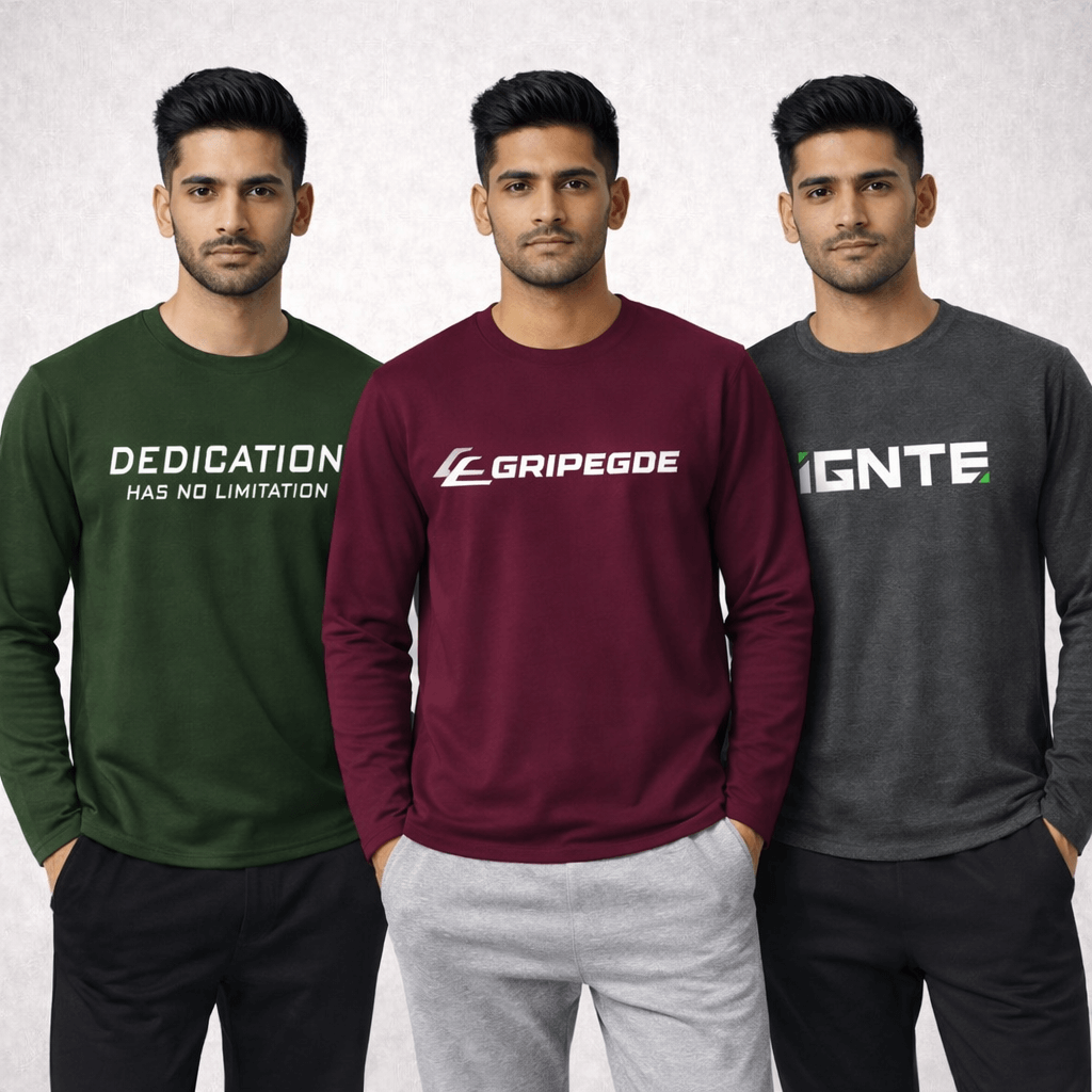 Pack of 3 Limitation Gripegde Printed Long Sleeve T-Shirts for Men is thoughtfully designed to boost your confidence while keeping your everyday style sharp and modern. These long-sleeve t-shirts offer a comfortable fit and a clean, trendy look, making them perfect for casual outings, daily wear, or relaxed weekends.