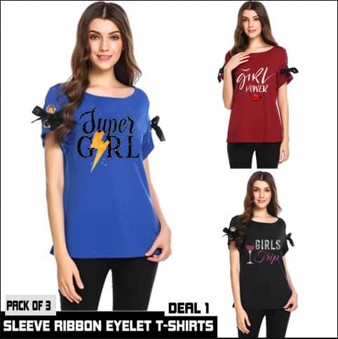 Get Pack of 3 Ribbon Eyelet Printed T-Shirts in just Rs 1099/- only