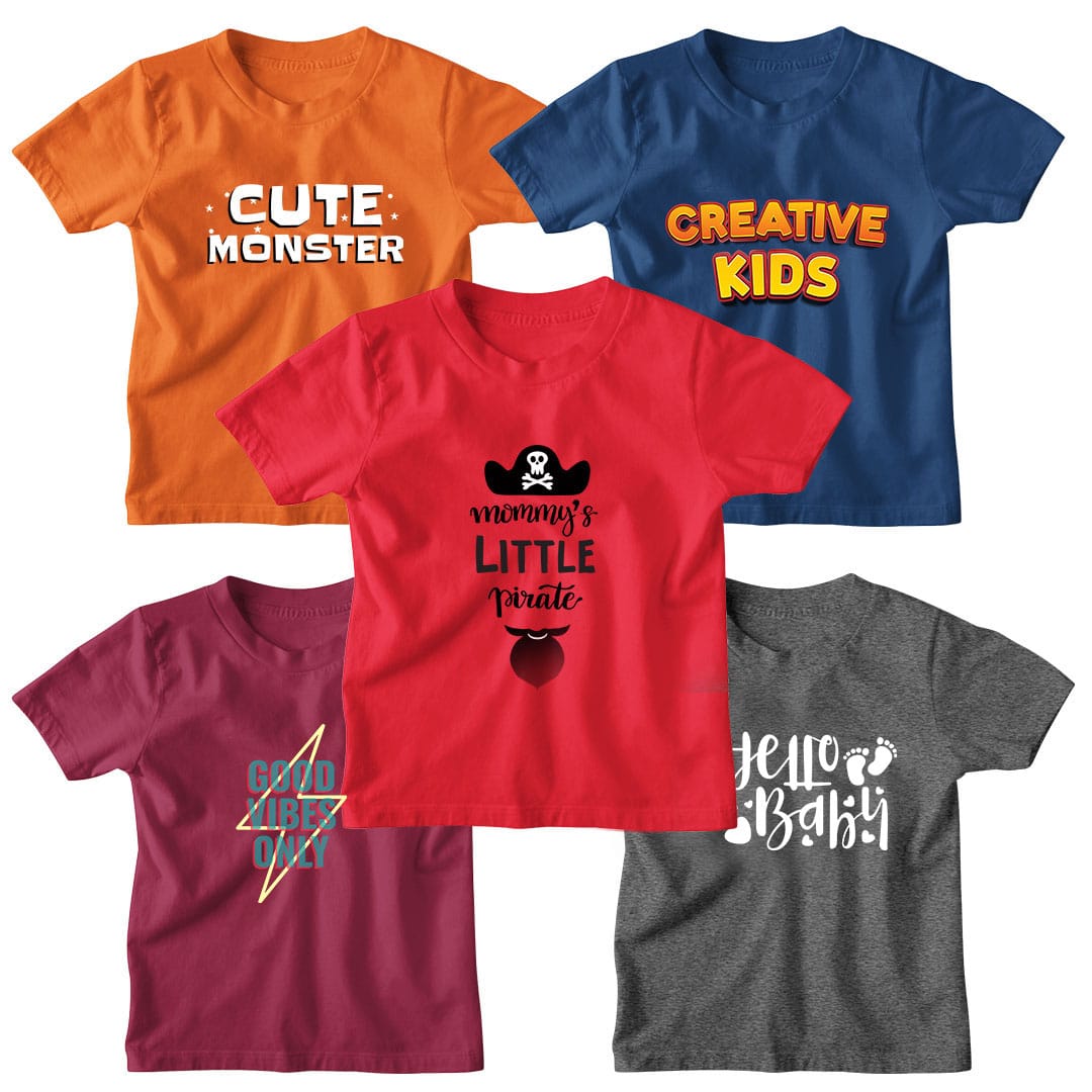 This bundle of kid’s printed t-shirts is perfect for any occasion! Crafted with poly cotton fabric and printed with vibrant colors, these t-shirts are sure to brighten up any outfit. They come in a variety of sizes, so you can find one to fit any kid’s taste. The soft fabric is comfortable to wear, making them perfect for all-day wear. With a wide selection of designs and styles, these t-shirts are a great way to show off your kid’s personality.