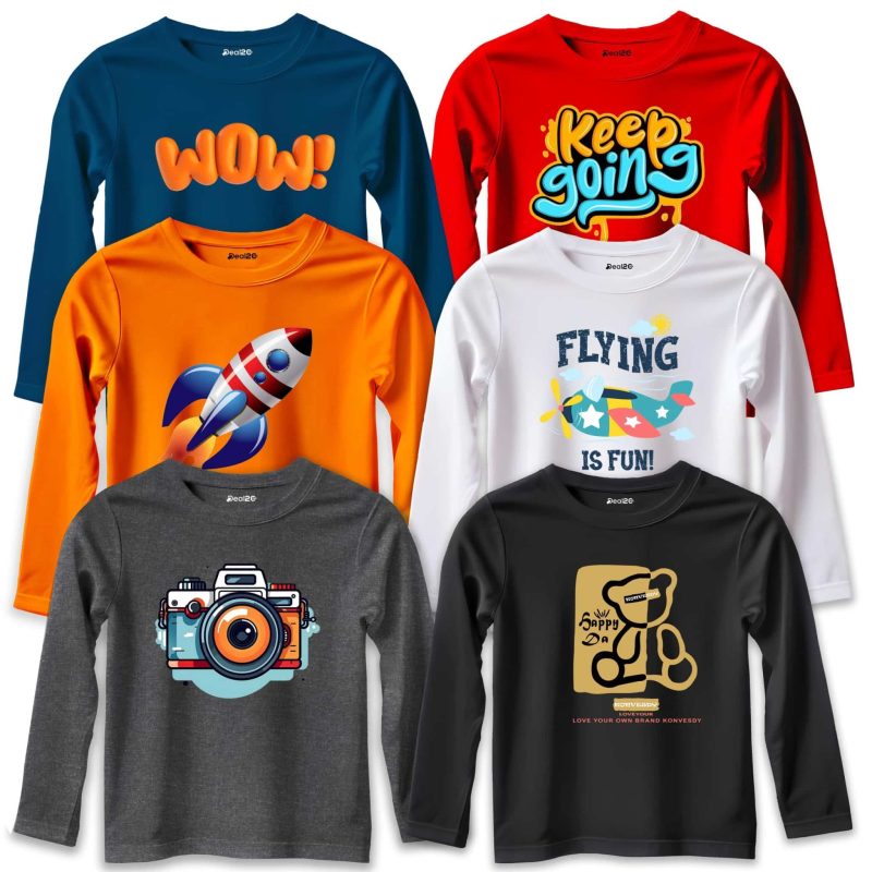 Pack of 6 Wow Bear Keep Rocket Flying Printed Long Sleeve T-shirts For Young Kids