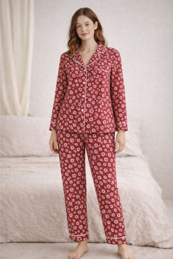 Experience timeless comfort with the Rose Rest Red Floral Nightwear Set for Women, crafted from breathable jersey fabric for all-night ease. This two-piece set features a passionate red base adorned with beautiful rose-inspired floral motifs, finished with chic piping details for a classic and bold look.