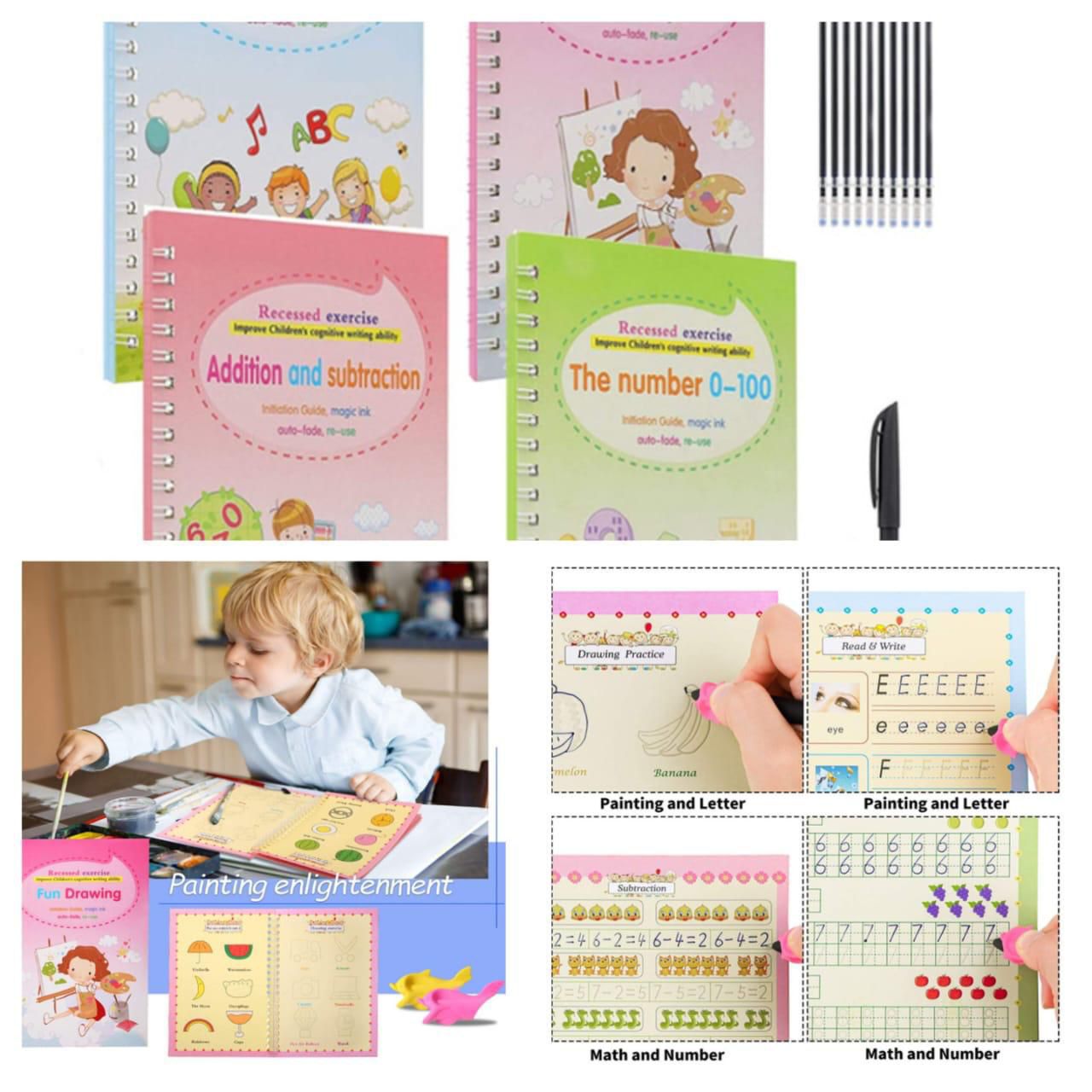 Each workbook focuses on different skills such as addition & subtraction, number tracing (0–100), alphabet writing, and fun drawing activities. The magic ink fades automatically after a short time, allowing kids to reuse the pages again and again. This eco‑friendly design saves paper while encouraging continuous practice.