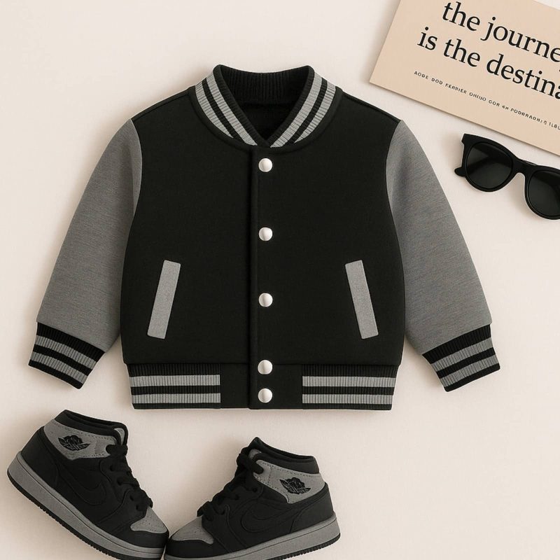 Made with premium polyester, the Shadow Storm Varsity Jacket offers cozy warmth while staying lightweight and breathable. The bold black-and-charcoal color combo gives it a cool, contemporary edge, making it the perfect go-to outerwear for school days, playdates, or weekend outings.