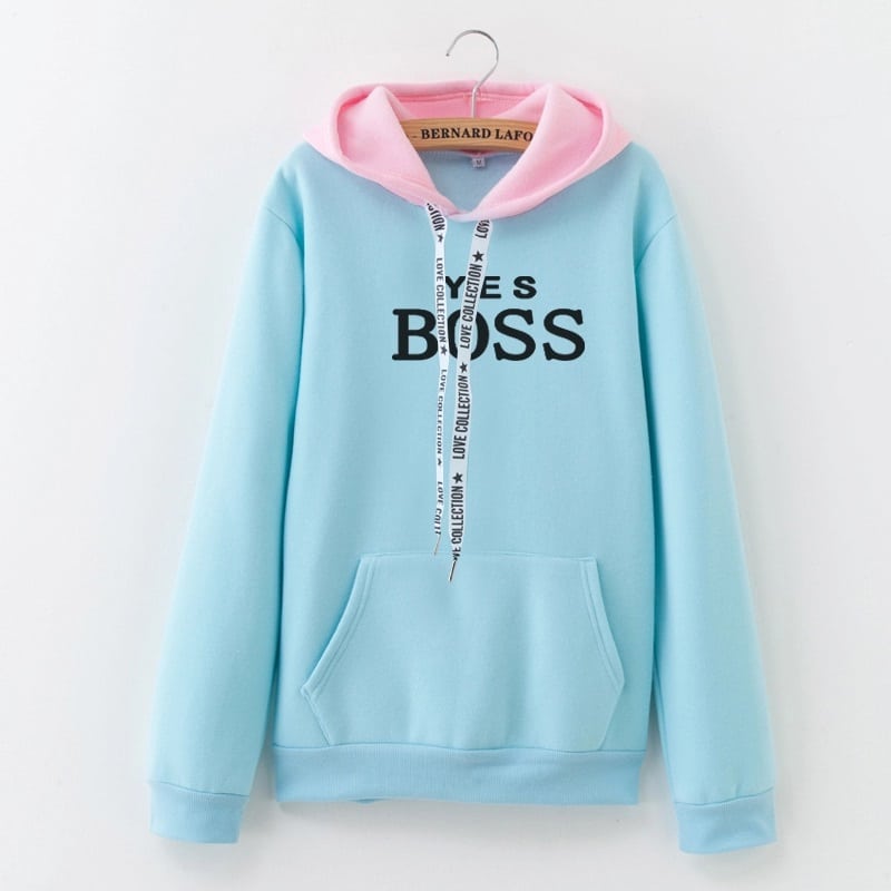 Get Sky Blue Yes Boss Printed Ladies Contrast Hoodie in just Rs 999/- only