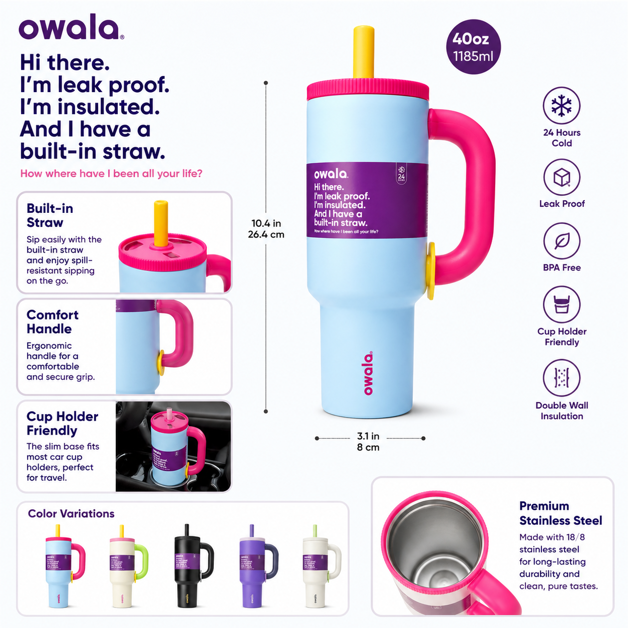 Its double‑wall insulation keeps drinks cold for up to 24 hours, while the leak‑proof design makes it perfect for travel, office, gym, or outdoor adventures. The slim base fits most car cup holders, and the ergonomic handle provides a comfortable grip. With a built‑in straw, sipping on the go is effortless and spill‑resistant.