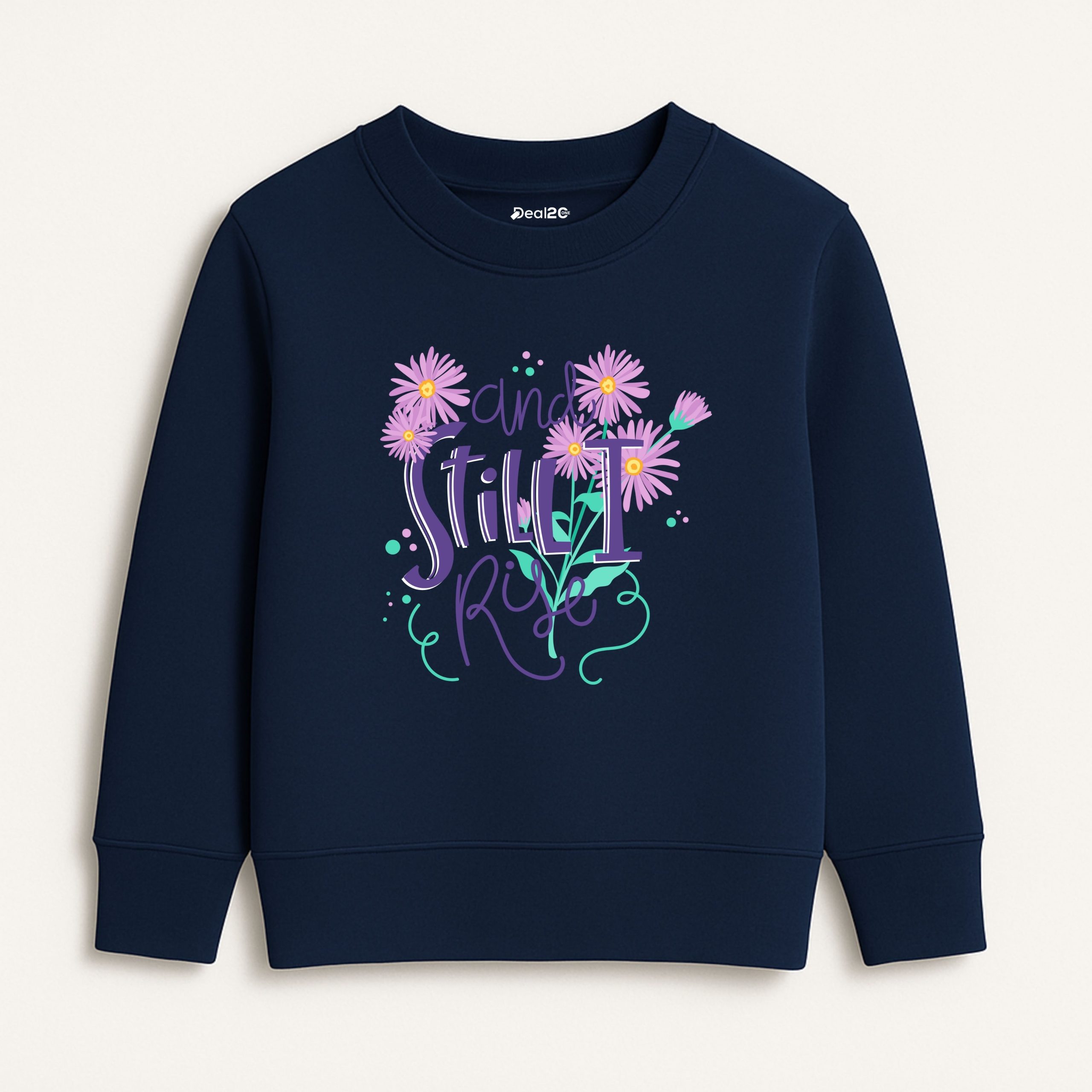 Add a touch of confidence and cozy comfort to her wardrobe with our Still Rise Printed Navy Blue Sweatshirt for Girls. Featuring a stylish and empowering “Still Rise” print, this sweatshirt blends modern design, warmth, and everyday wearability. Whether she’s heading to school, spending time with friends, or enjoying family outings, it keeps her comfortable and confident all day long.
