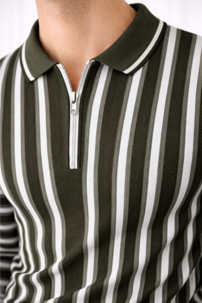 Featuring a trendy striped pattern with a smart zip collar and a classy army green color, this shirt gives you a bold and fashionable look. The comfortable fit and long sleeves make it easy to pair with jeans, trousers, or chinos. Whether you’re going out casually, meeting friends, or just relaxing, this shirt is a perfect choice for a smart-casual style.