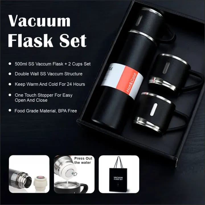 The Vacuum Flask Set – Stainless Steel Flask with 2 Cups is a premium drinkware solution designed for convenience, durability, and everyday use. Featuring a double‑wall stainless steel vacuum flask and two matching cups, this set is perfect for office, travel, picnics, or gifting.