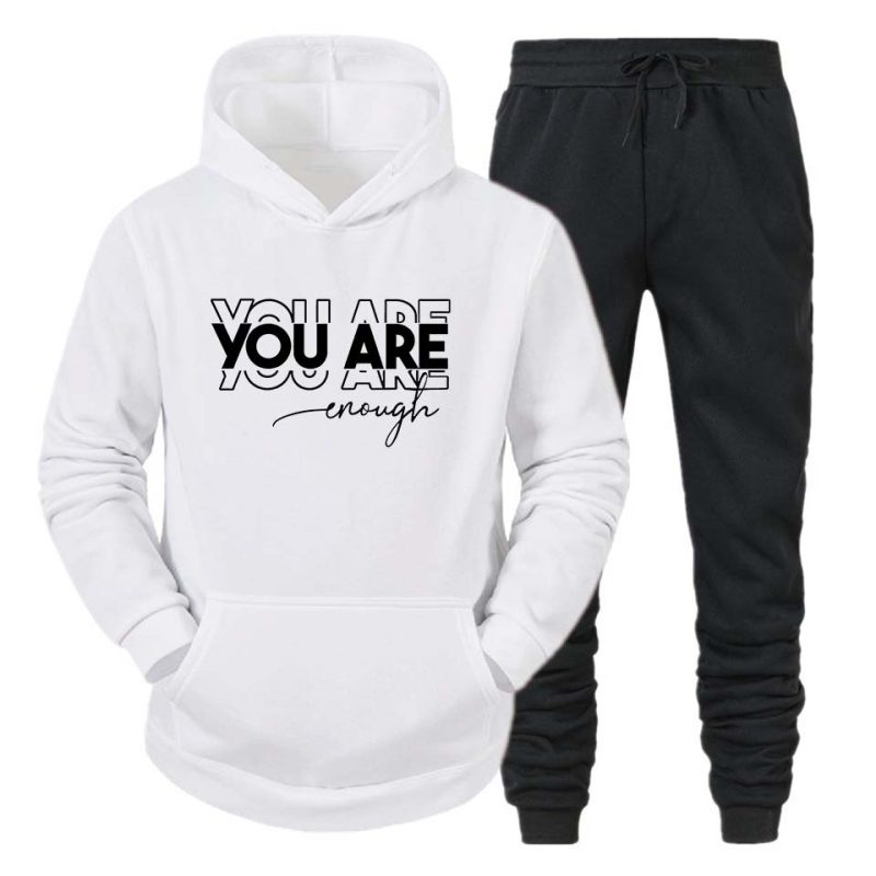 Modern Design: The sleek, modern silhouette fits perfectly, providing a flattering and trendy look. The hoodie comes with an adjustable drawstring for added style and function, while the matching track pants feature an elastic waistband for a comfortable, customizable fit.